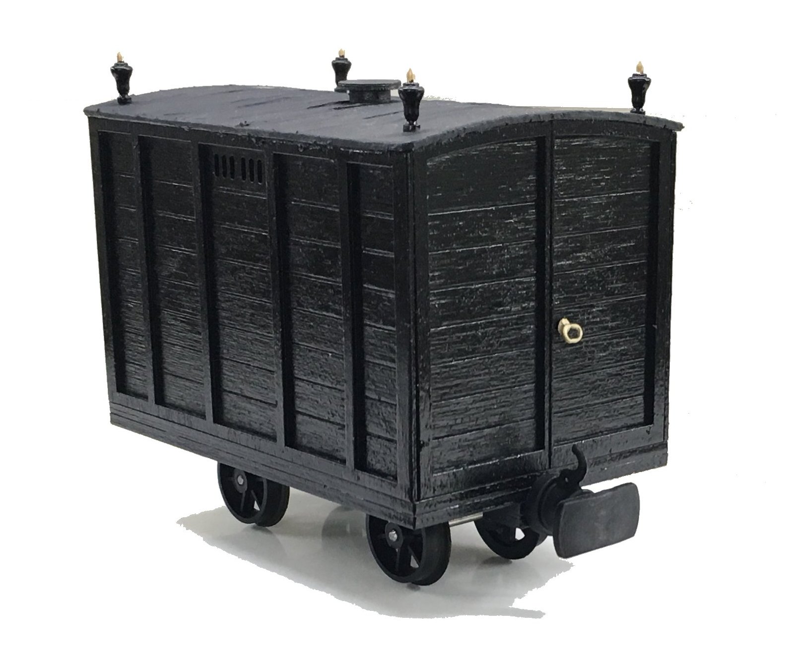 A very accurate scale 16mm/foot model of the Ffestiniog Railway’s Hearse Wagon used to transport passengers on their final journey.